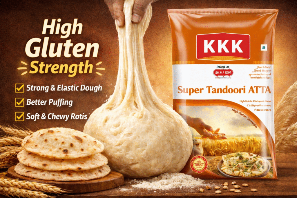 KKK Super Tandoori Atta contains high gluten content, providing excellent elasticity for easy stretching, shaping, and perfect tandoori breads like naan and kulcha.